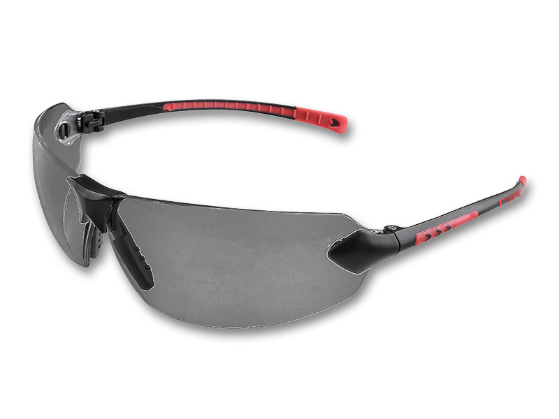 Polikarbonatiniai stiklai plonais elastingais šonais, kurie nesukelia spaudimo ir galimybe reguliuoti skydelio kampą. Tinka naudoti su šalmu ar kauke, dirbant statybvietėse ir sandėliuose. Spalva – juodai raudona Skydelis – dūmai Medžiagos sudėtis – polikarbonatas Standartai EN 166, EN 172 Apsauga nuo UV spindulių – UV 400 1 optinė klasė Mechaninis stiprumas – F