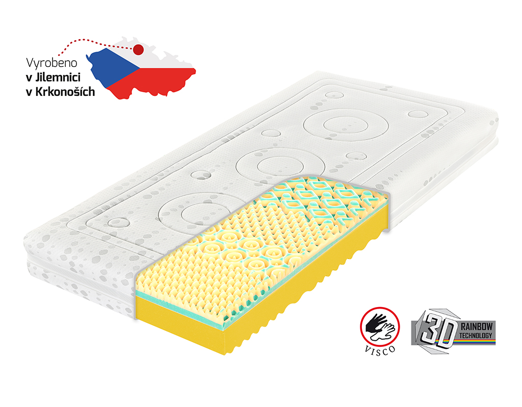 Prabangus čiužinys „abiems“ su 3D Rainbow technologija (1 sluoksnis VISCO porolono itin aukštame masyviame 3D lankstaus hibridinio putplasčio sluoksnyje) = puikus orumas, anatominis masažo profiliavimas. Čiužinys turi skirtingą šonų standumą (minimali netinkamo pasirinkimo rizika). Skalbiamas užvalkalas.