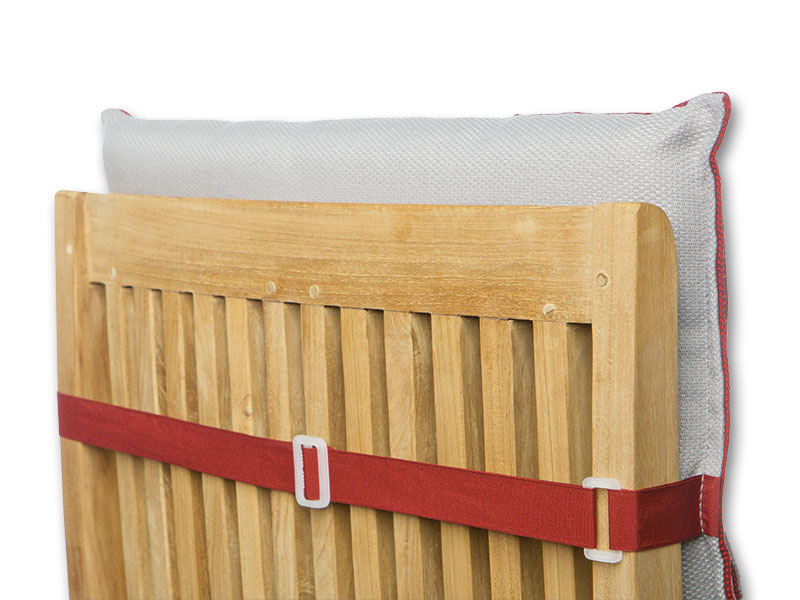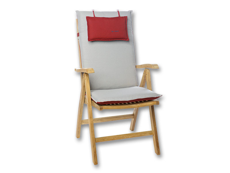 Fotelio užvalkalas DE LUXE CARMINE su raudonos/šviesiai pilkos spalvų derinio pagalvėlėmis yra apverčiamas, todėl galite pakaitomis keisti galinę ir priekinę dalį. Vandenį atstumiantis audinys, pagamintas iš sintetinio olefino pluošto, pasižymi puikiu atsparumu dilimui ir spalvos atsparumu (7-8 klasė), taip pat aukšta apsauga nuo UV spindulių (80). Jis taip pat impregnuotas nuo pelėsio ir nešvarumų. Užvalkalas prie kėdės tvirtinamas diržu ir raišteliais. Tada galvos atrama lengvai pritvirtinama prie dangtelio mygtukais. Patogus užtrauktukas leidžia nuimti užvalkalą nuo užpildo, kad jį būtų galima skalbti.