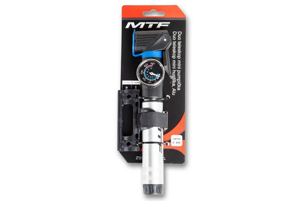 Praktiškas aliuminio pripūtimo įrenginys su manometru, tinkamas montuoti ant rėmo. Universali galvutė automobiliui ir vožtuvo kotas. Praktiška greito atleidimo svirtis užtikrina puikų sukibimą su vožtuvu ir neleidžia orui išeiti. Ilgis 200 mm.