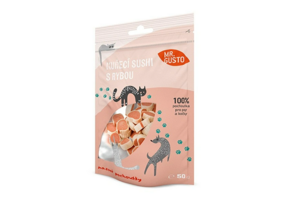 Pagrindinis » Naminių gyvūnėlių maistas » Skanėstai augintiniams » Mr. Gusto Vištienos Suši Su Žuvimi, 50G