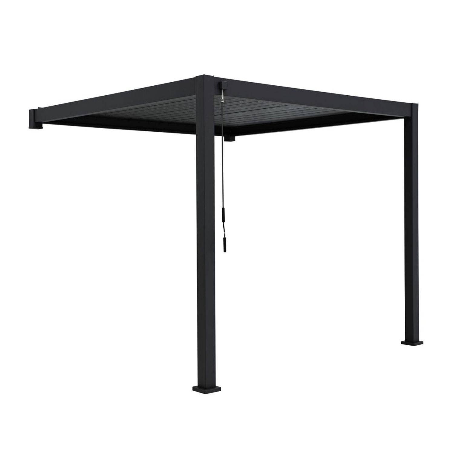 Pavėsinė MIRADOR 3×4 m su 2 stulpais, montuojama ant sienos. Moderni, elegantiška ir funkcionali pavėsinė tinka visur – sode, terasoje, prie baseino ar kaip automobilio stoginė, be to, ją galima naudoti ištisus metus. Novatorišką žaliuzinį stogą galima atidaryti ir uždaryti rankenėle, jis suteikia apsaugą ir pavėsį nuo lengvo lietaus ir kaitrios saulės. Dėl uždarytų žaliuzių stogas visiškai nepraleidžia vandens. Dėl įmontuotos lietaus nuvedimo sistemos vanduo nuo stogo nuvedamas saugiai. Pasirinktinai galima pasirinkti atitinkamo tipo sieneles arba užuolaidas, taip suteikiant pavėsinei kitokią išvaizdą ir funkcionalumą. Į kainą neįskaičiuotos šoninės sienelės ir užuolaidos, jas reikia užsisakyti atskirai. Pagrindinė pavėsinės konstrukcija pagaminta iš aliuminio ir nudažyta tamsiai pilkais milteliniais dažais. 2 atraminiai stulpai, kurių matmenys 111×111 mm, horizontalioji sija 140×75 mm ir cinkuoto plieno stogo žaliuzės 172,5×30 mm. Pavėsinę sumontuokite ant stabilaus ir lygaus paviršiaus ir tinkamai pritvirtinkite. Jei markizę naudosite ištisus metus, įsitikinkite, kad ant stogo nėra per daug sniego. Kuo greičiau pašalinkite susikaupusį sniegą. Įsitikinkite, kad vandens nutekėjimo angos yra laisvos. Prieš prasidedant žiemos sezonui įsitikinkite, kad šoniniuose stulpeliuose nesikaupia vanduo. Jei vanduo užšals, jis gali sugadinti stulpus.