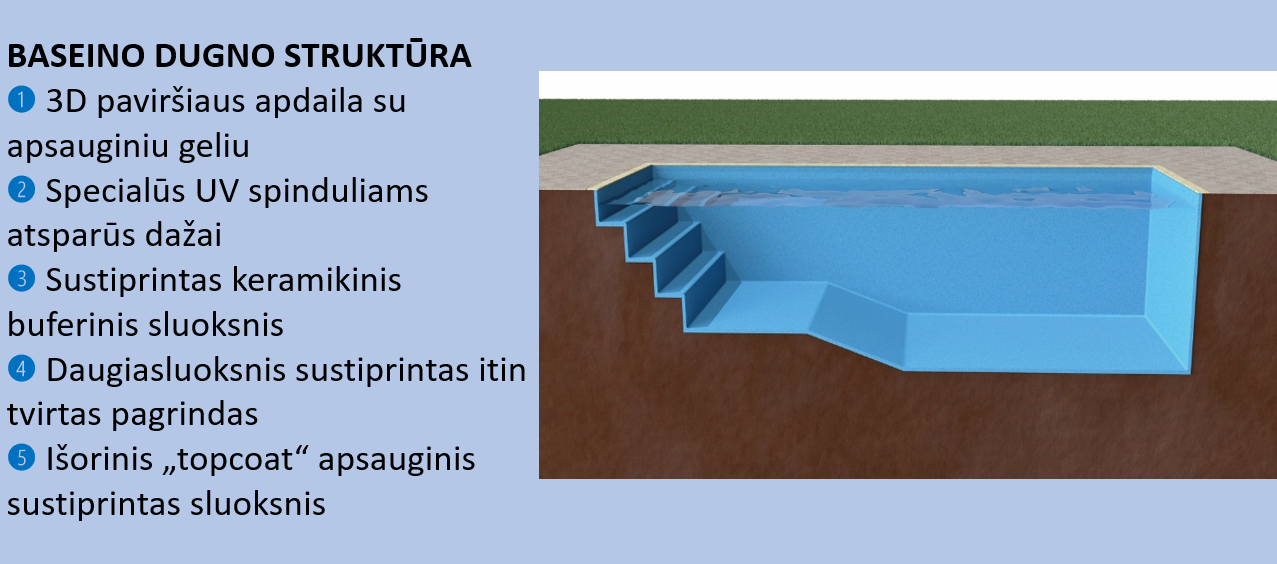 Kelių lygių baseino dugnas su sustiprintais sluoksniais: UV apsauga, keramikinis amortizatorius, plieninis pagrindas ir antistatinė danga.