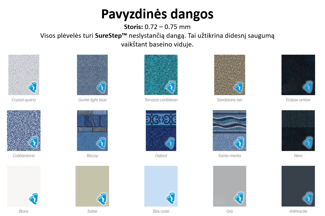 Galima rinktis iš daugiau nei 30 dangos raštų. Visi paviršiai dengti SureStep™ sistema – neslidūs ir saugūs.