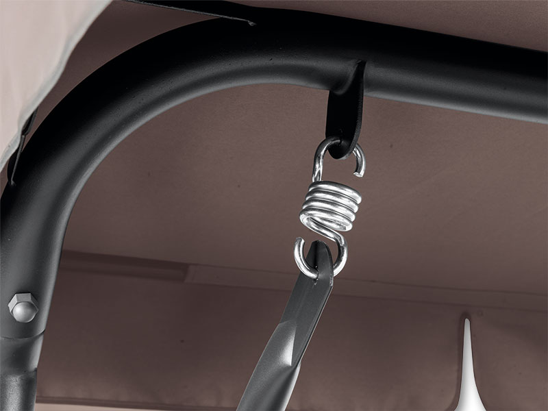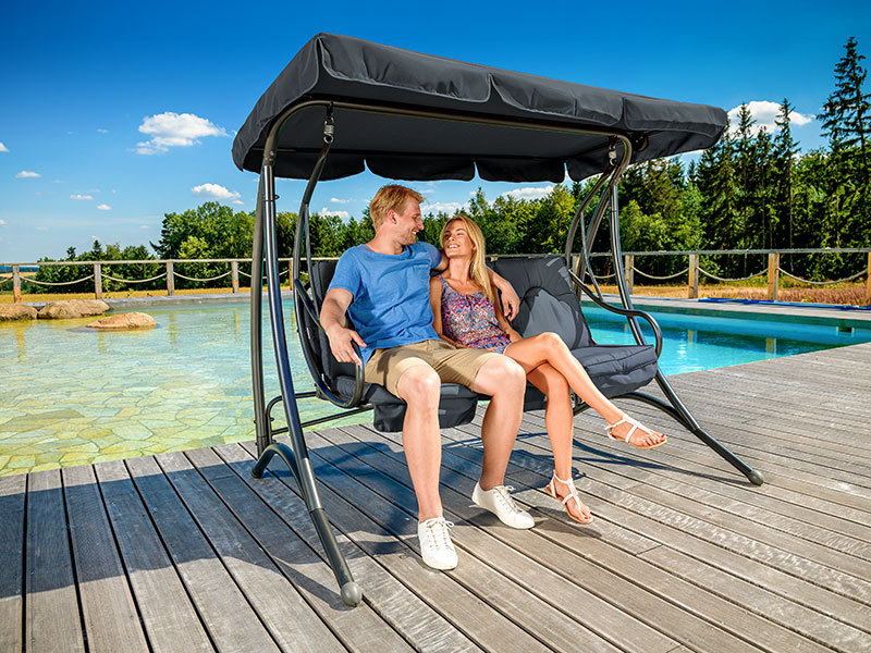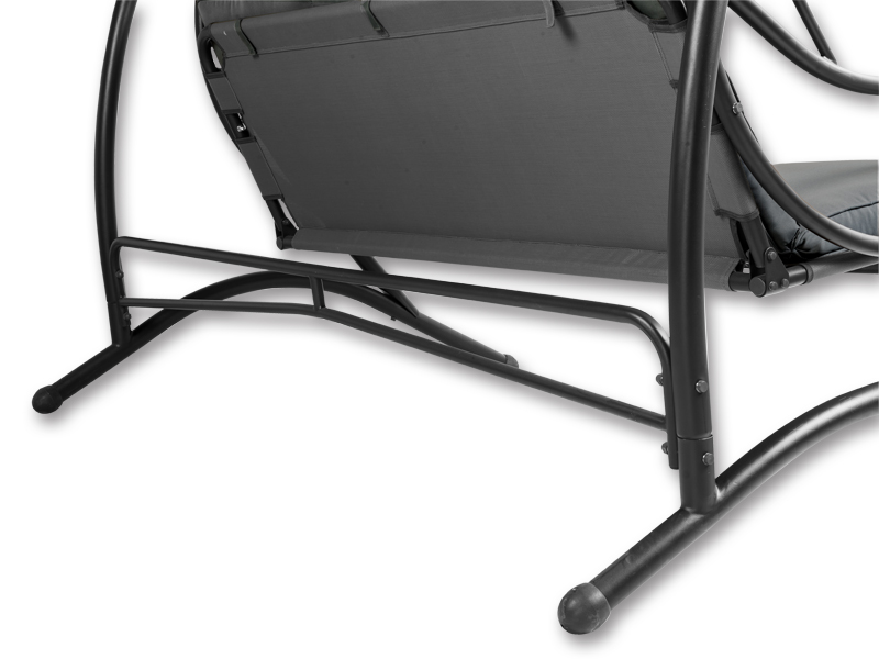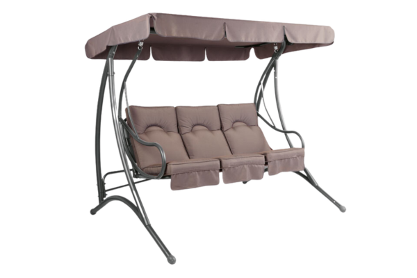 Trivietės supynės su itin patvaria plienine konstrukcija yra su stogeliu, apsaugančiu nuo saulės spindulių. Prie sūpynių pridedami užvalkalai. Galimos skoningos rudos ir antracito spalvos.